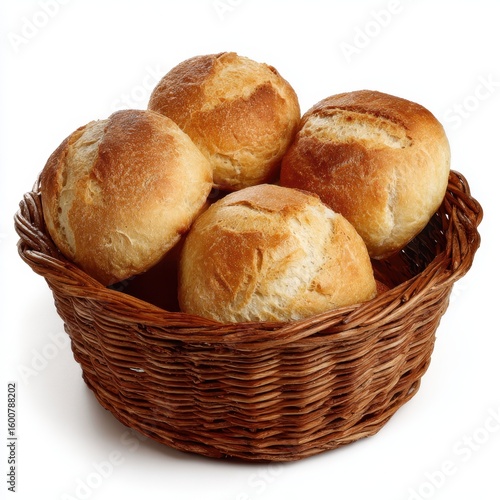 Four fresh bread rolls in a basket isolated on white background