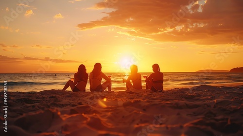 Four friends enjoying a sunset on the beach with drinks in hand.