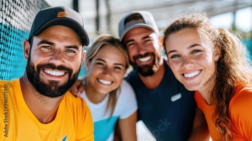 Four friends smiling together during an outdoor tennis match, conveying unity, friendship, and sportsmanship. The image is perfect for themes involving recreational sports and group activities.