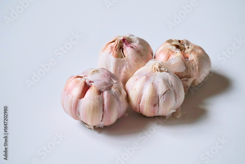 Four garlic cloves on a white background
