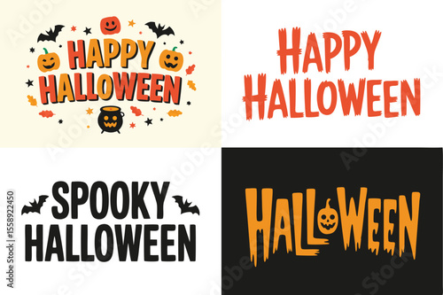 Four Halloween Illustrations Happy Halloween, Spooky Halloween, Halloween Art on White and Black Background
