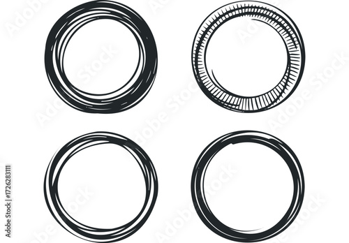 Four Hand Drawn Circle Frames with Varied Textures. Vector hand drawn illustration