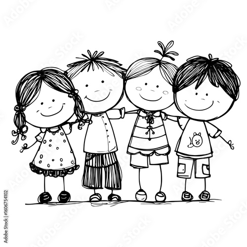 Four happy kids, a mix of girls and boys, are shown in a contour drawing that is part of a funny black modern illustration on a white background