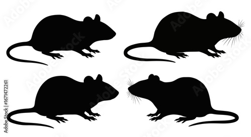 Four identical black silhouettes of a small rodent possibly a mouse or rat shown from the side on a white background silhouette