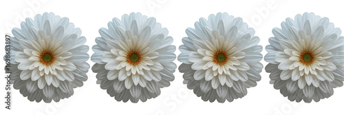 Four identical white flowers with layered petals, featuring soft grayish-blue on the outer petals. Each flower has bright orange stamens surrounding a small green core.