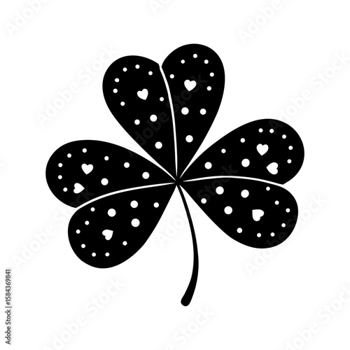 Four Leaf Clover Icon with Hearts and Dots. Lucky Shamrock Silhouette Vector Design.