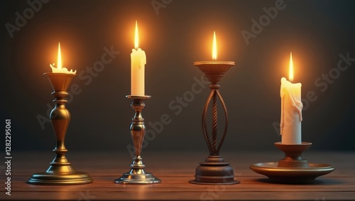 Four Lit Candles in Antique Candelabra on Wooden Table Romantic Atmosphere Warm Light