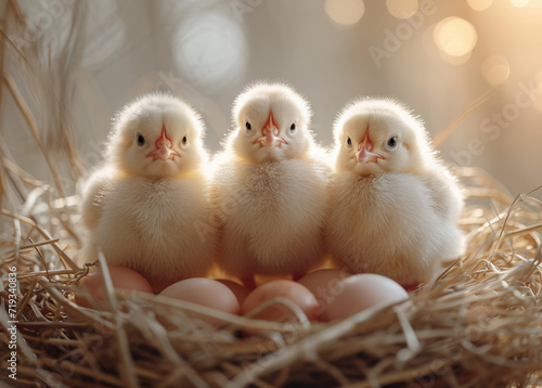 Four little chicks in the straw nest. Chicken sitting in a basket of eggs