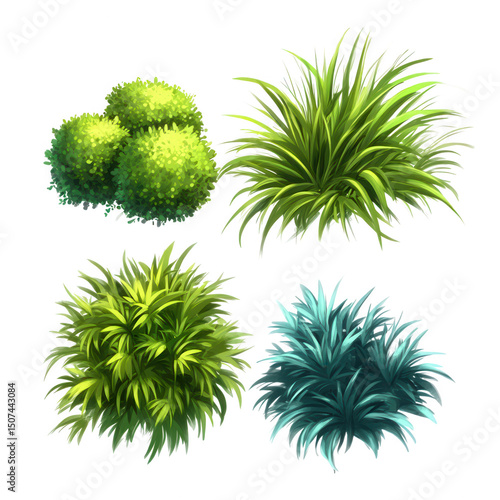 Four lush green bushes isolated on transparent background