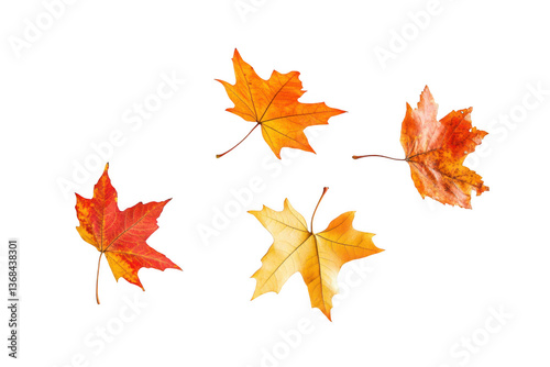 Four maple leaves in various fall colors on a transparent background
