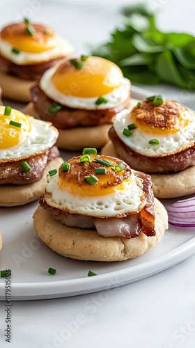 Four mini golden-brown eggs in ramekins are garnished with chives and served on crispy crackers, surrounded by fresh basil and onion