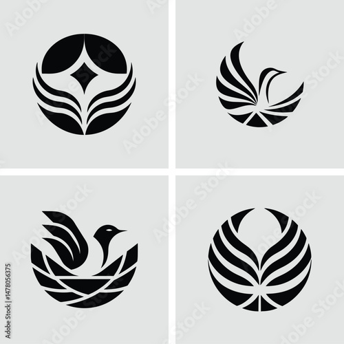 Four modern black and white logo designs for branding icons featuring birds and floral abstract elements