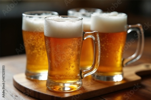 Four mugs of beer on a tray — Oktoberfest and Bavarian festival atmosphere