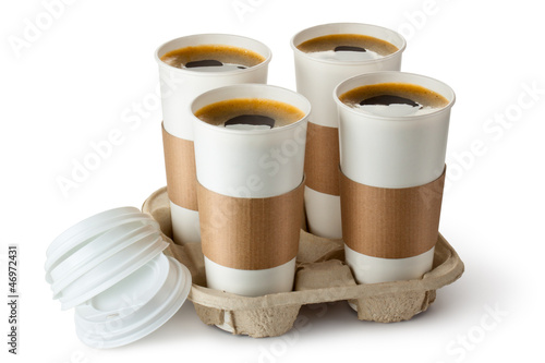 Four opened take-out coffee in holder