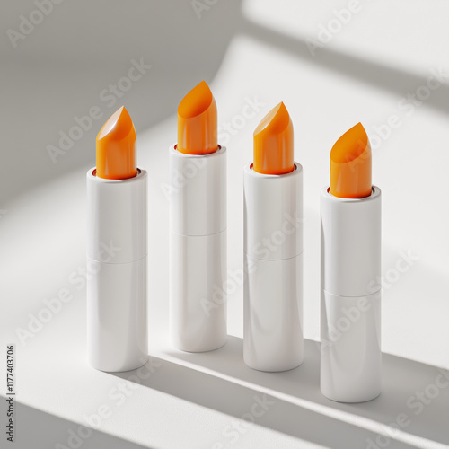 Four orange tipped lip balms arranged neatly on light surface, showcasing their vibrant color and sleek design. soft shadows enhance their modern aesthetic