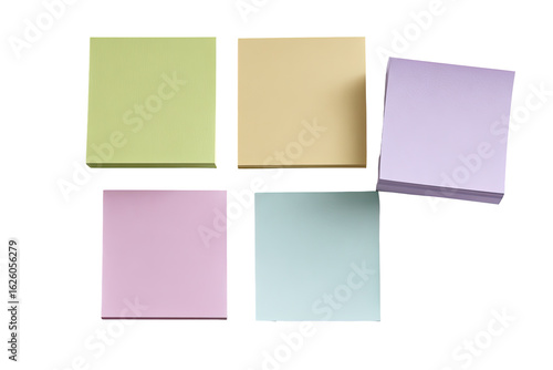 Four pastel-colored sticky notes arranged in a loose, overlapping grid. Each note is a square, slightly angled, with visible edges