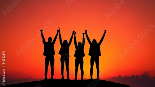Four people standing silhouetted on a horizon with arms raised