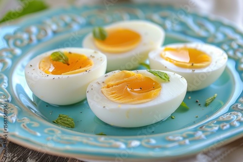 Four perfectly boiled egg halves seasoned with black pepper and garnished with fresh mint leaves are served on a light blue plate