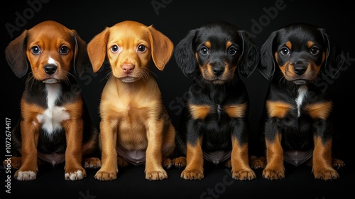 Four puppies are sitting in a row, with one of them being brown and the other three being black