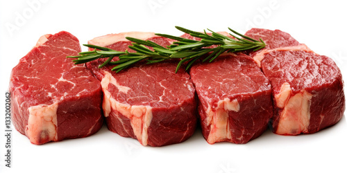 Four raw beef steaks with rosemary on white background