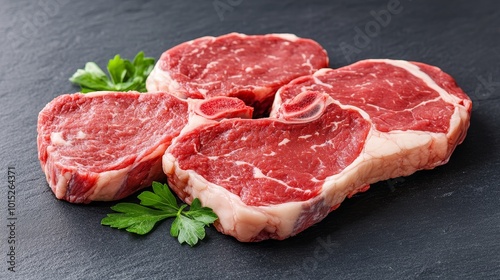 Four Raw Ribeye Steaks with Fresh Parsley, Prepared for Cooking on a Dark Grey Background