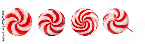 Four red and white peppermint candies isolated on white background, offering a sweet and colorful treat for the holiday season and celebrations.