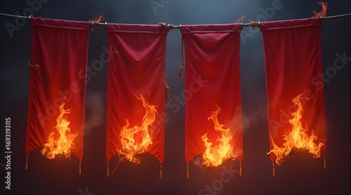 Four red banners burning fiercely with vibrant orange flames hanging in a row against a dark smoky ominous background symbolizing protest rebellion and conflict.