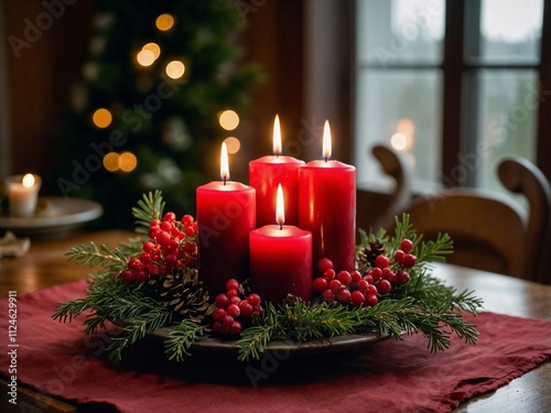 Four red candles glowing brightly on a festive table with Christmas greenery decor