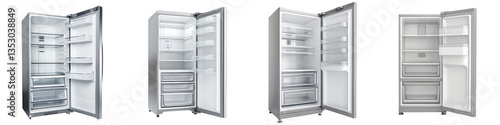 Four Refrigerators with Open Doors, Shelves and Drawers Displaying Internal Storage Solutions.