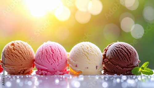 Four scoops of colorful ice cream chocolate vanilla strawberry and caramel sit on a reflective surface