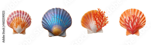 Four seashells isolated on white, diverse colors. Summer, marine life, ocean, beach, collection, souvenir