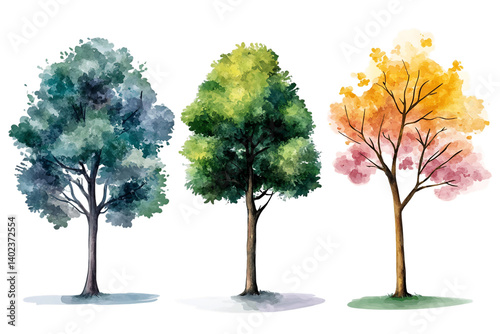 Four Seasons Watercolor Trees: Winter, Spring, Summer, Autumn, PNG