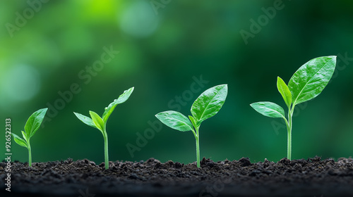 Four seedlings in various growth stages emerging from soil, vibrant green background