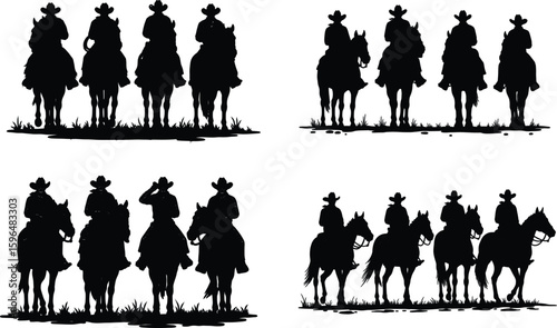 Four silhouette scenes of cowboys on horseback in a western landscape