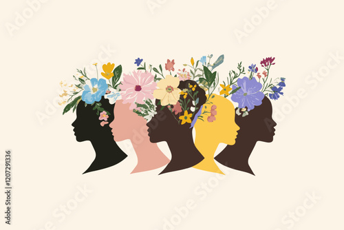 Four silhouetted female profiles with vibrant floral crowns.