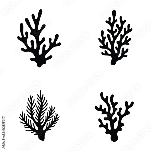 Four silhouettes of marine organisms and plants isolated on a white background
