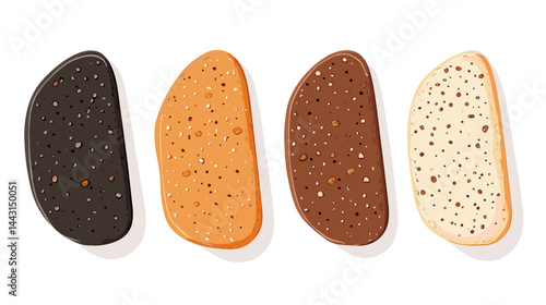 Four Slices of Bread in Various Shades of Brown and Beige on White Background