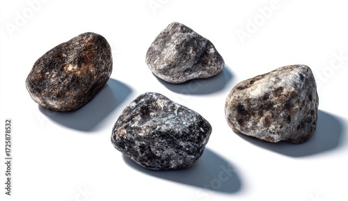 Four smooth, round stones of varying shades of gray and brown, set against a white background