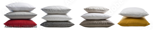 Four stacked decorative pillows in various colors and textures on a white isolated background.