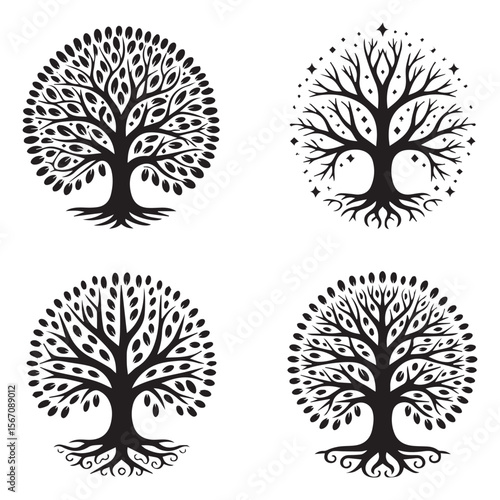 Four stylized black silhouette trees with intricate roots and leaves on white background