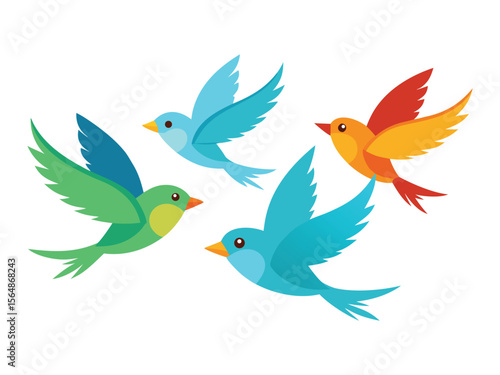 Four stylized cartoon birds in flight with colorful wings and bodies against a white background