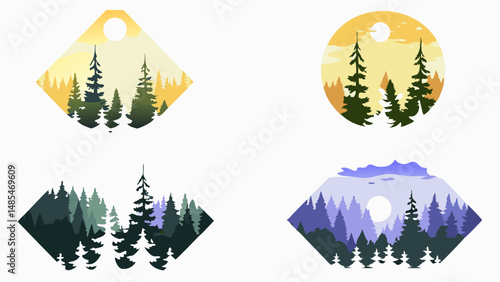 Four stylized forest scenes with trees and sun in diamond and circle shapes on a white background view art