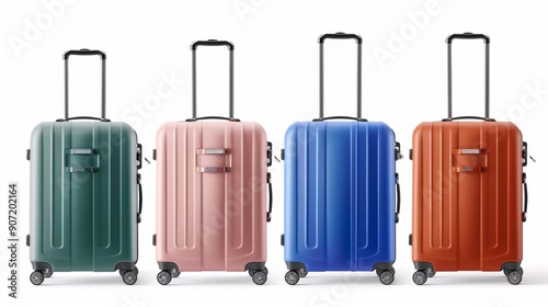 Four suitcases of different colors are lined up next to each other