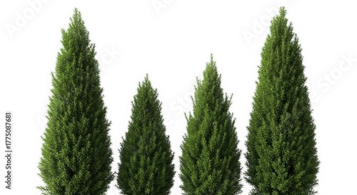 Four tall green cypress trees with distinct shapes standing in a row isolated on white background