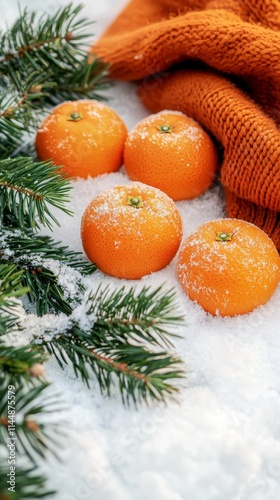 Four tangerines lie on the snow, covered with a light dusting of snowflakes, alongside fresh pine branches, evoking a cozy and festive winter scene