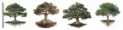 Four unique trees with detailed roots showcasing seasonal changes on transparent background