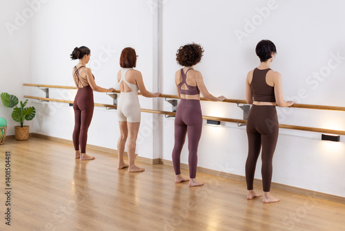 Four unrecognizable women practicing barre in a bright studio, combining ballet, pilates and yoga. Fitness, focus, wellness. Clear white space. Horizontal, copy-space.