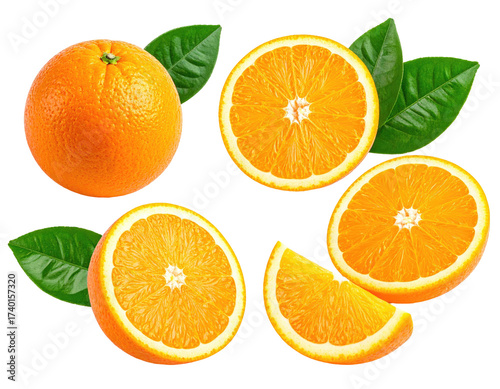 Four vibrant oranges, whole and sliced, with fresh leaves