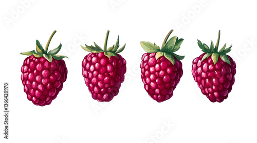 Four vibrant raspberry fruits, artistic illustration style, cut out transparent