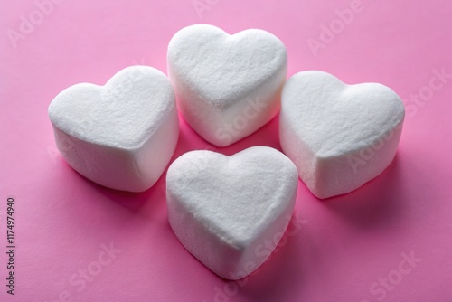 Four White Heart Marshmallows on Pink Background - Sweet Valentine's Day Treat
